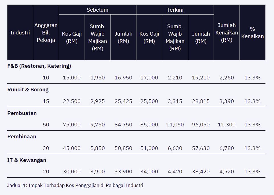 Selain kenaikan gaji asas, majikan juga perlu menanggung kenaikan caruman KWSP dan PERKESO, yang meningkatkan keseluruhan kos penggajian lebih daripada kadar kenaikan gaji itu sendiri.